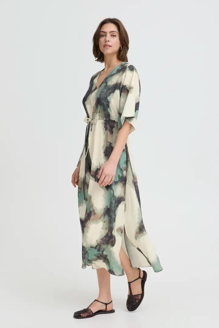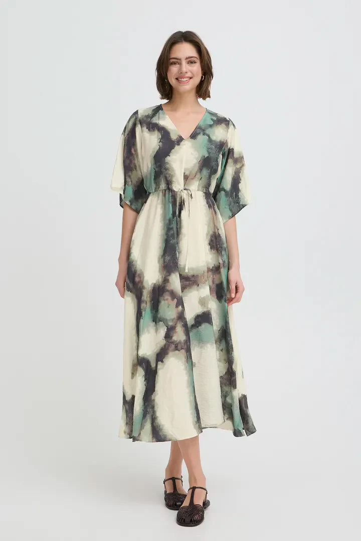 Fransa - Ayla Dress in Bronze/Green Pattern on Ivory
