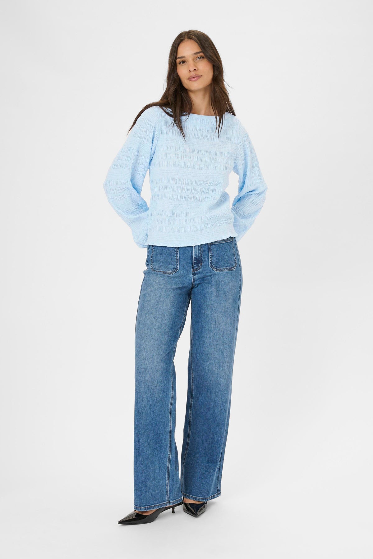 Effortless elegance in soft pale blue. This Kourtney blouse features a classic boat neck and flattering ruched detailing for a refined silhouette. Elasticated cuffs ensure a comfortable, adjustable fit throughout the day. Crafted from a luxurious blend of 70% viscose, 28% polyester, and 2% elastane, the fabric drapes beautifully while maintaining its shape. The viscose content delivers a smooth, breathable feel, while the elastane provides gentle stretch and recovery. Perfect for layering or wearing solo, this long sleeve top transitions seamlessly from office to weekend wear.