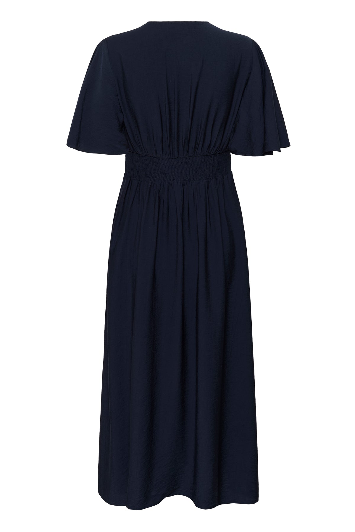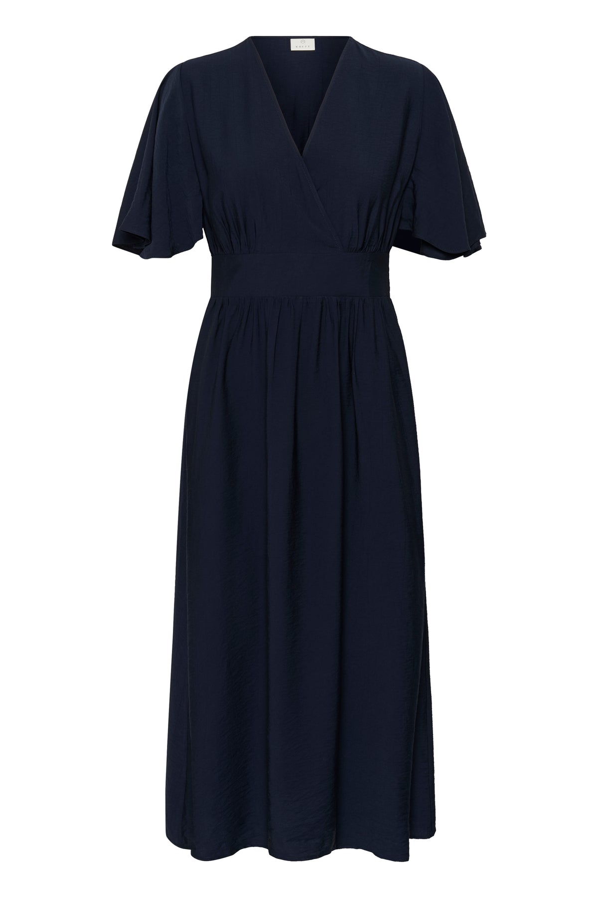 Elegant calf-length dress featuring a crossover V-neckline and flattering bell sleeves. The fitted waist is cinched with subtle ruching at the back for added dimension and comfort. Crafted from a luxurious blend of 87% viscose and 13% polymide, this navy piece drapes beautifully and moves with ease. Perfect for both everyday sophistication and special occasions.