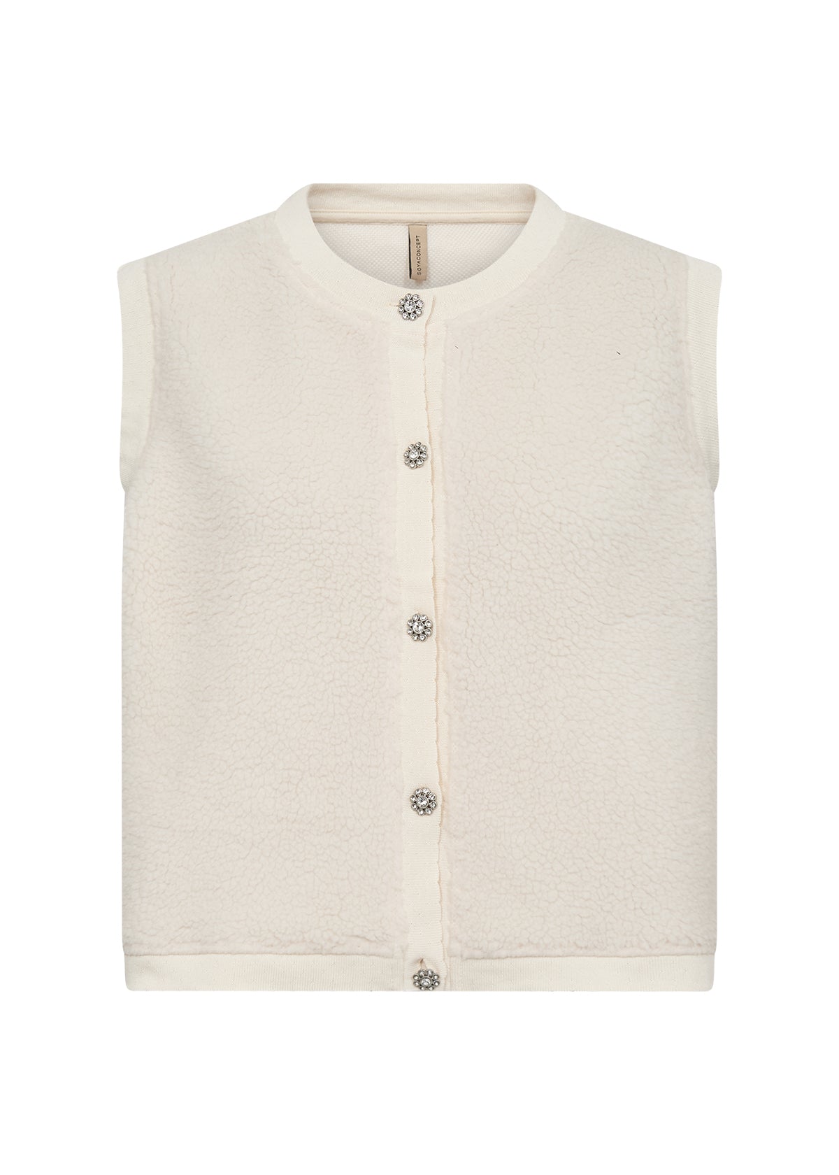 Cosy up in the Soyaconcept Onyx Waistcoat, where creamy fleece meets sparkling diamante buttons for a fun twist on warmth. The elasticated trim adds a snug fit that moves with you, making this waistcoat your new go-to for effortless style and comfort. Perfect for layering with a playful edge!