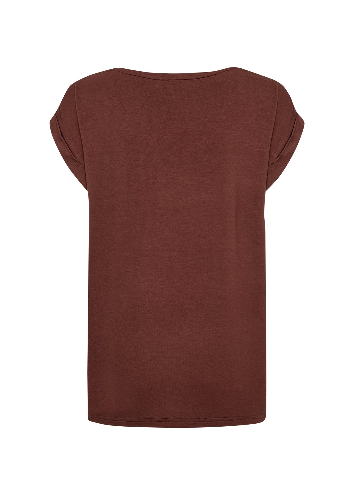 This  seasona's classic Thilde top from soyaconcept comes in a rich chocolate brown. Silky fabric at the front and t-shirt like at the back with cap sleeves.