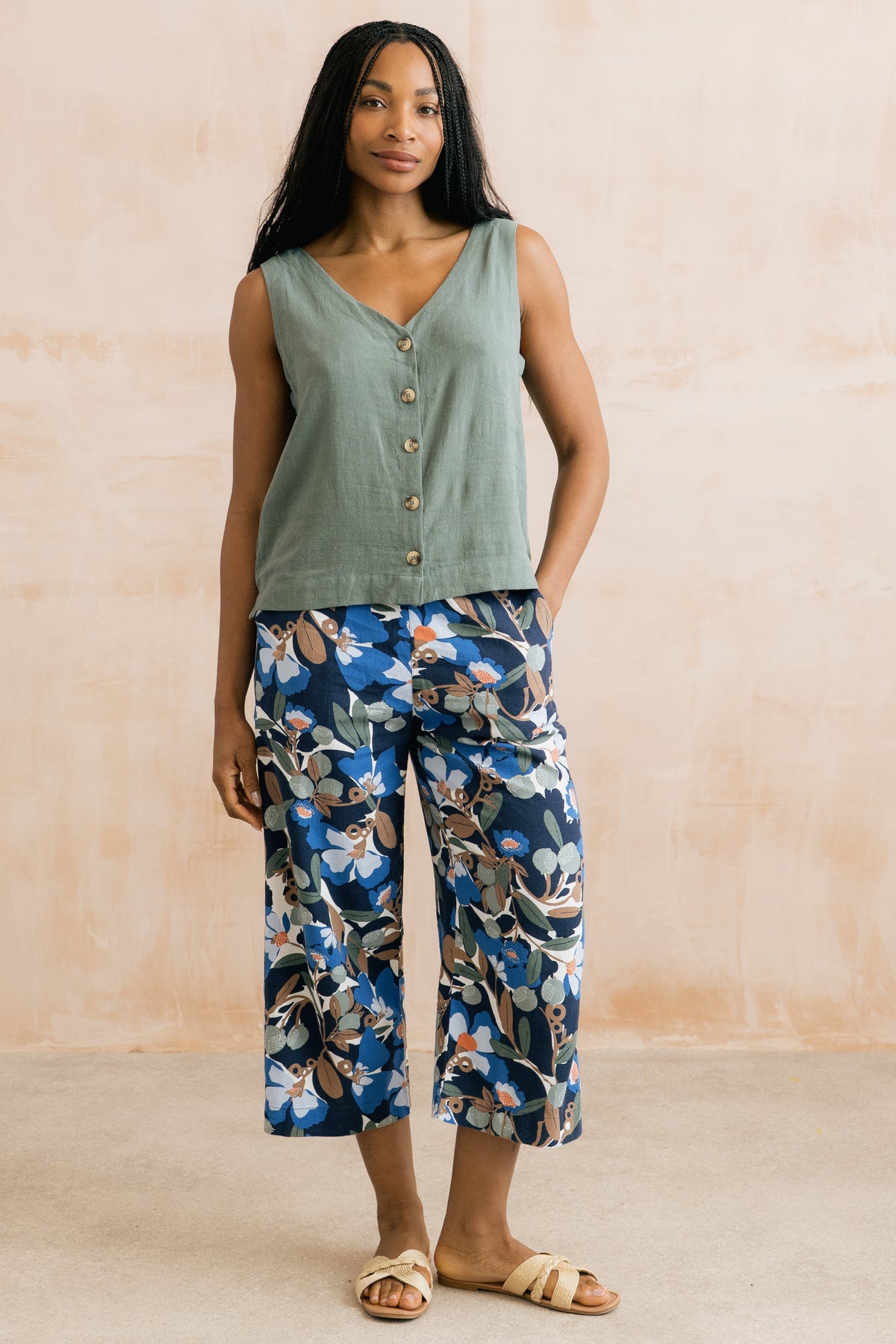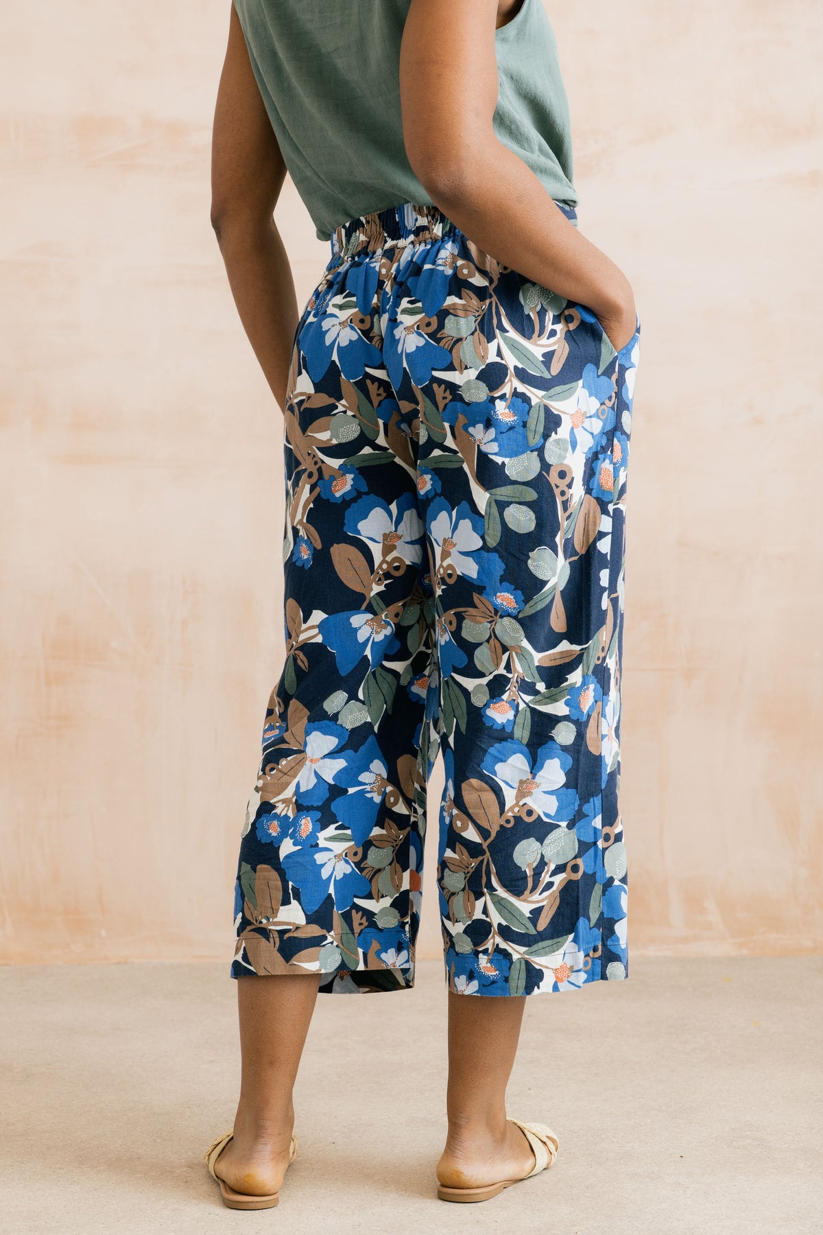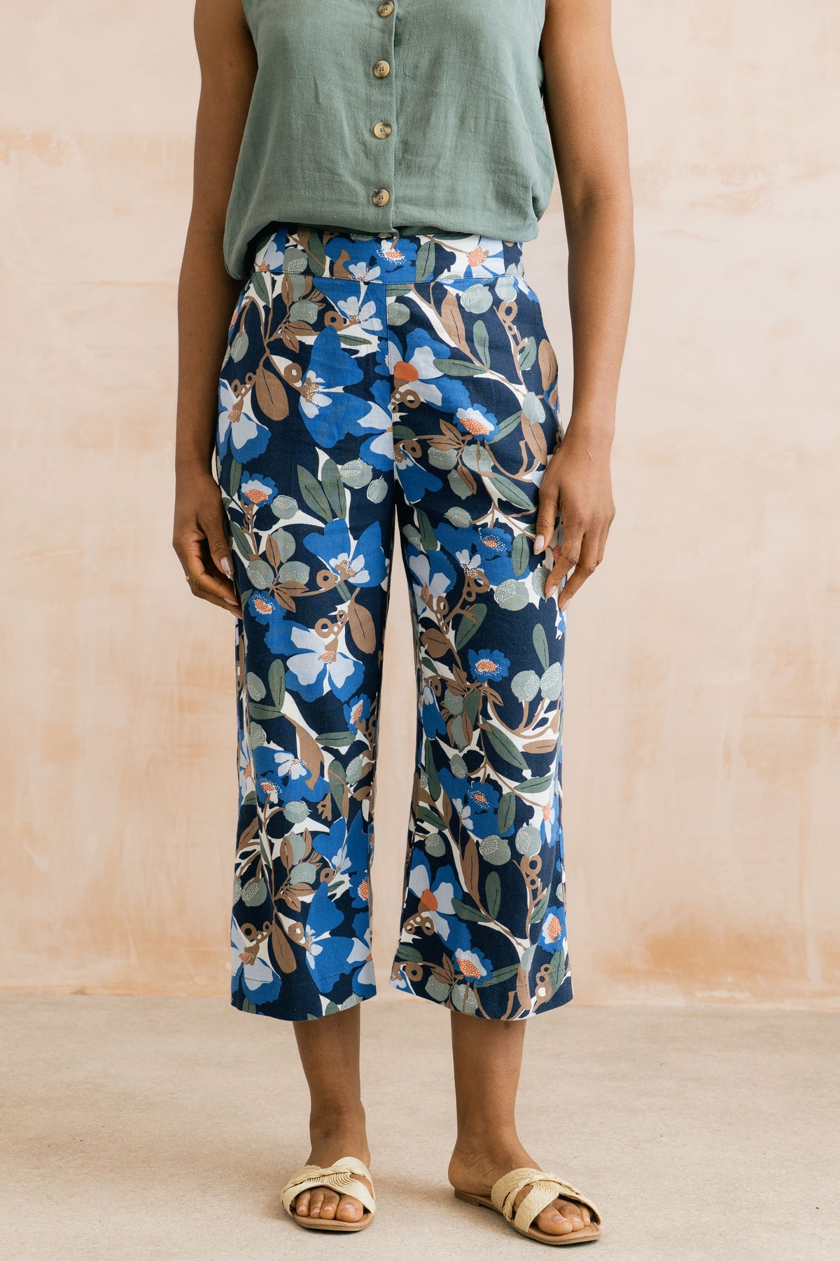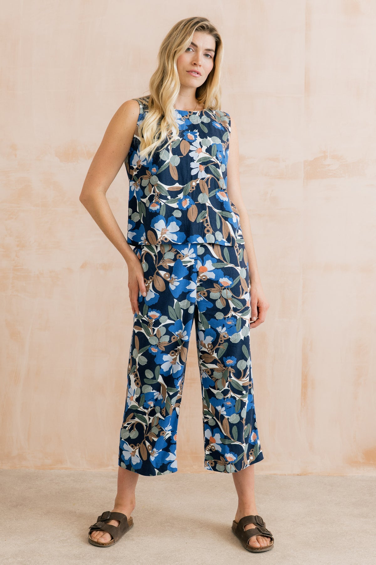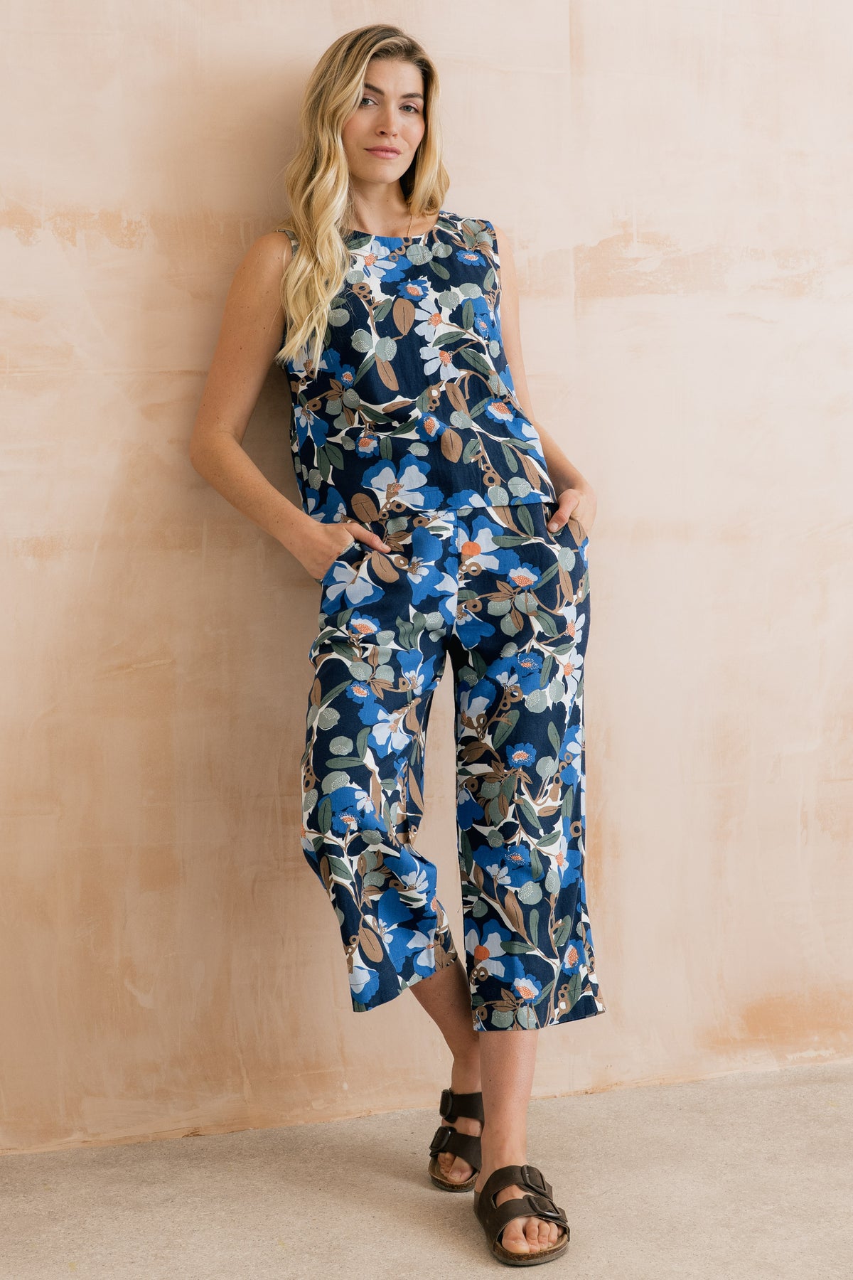 Every summer Lily offers us lovely linen mix trousers - we are certain this year's Gretas will prove very popular with its sprawling floral print in pretty muted shades of blue, brown, green and cream on a classic navy background. Elasticated at the back and with side pockets, these are the epitome of smart casual. And there is a matching top if you fancy.